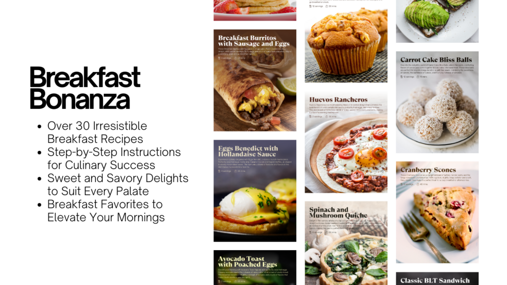 - Plus... many more mouthwatering recipes to explore! Whether you're a fan of savory or sweet, "Breakfast Bonanza" has something to satisfy every craving.